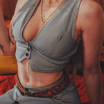 Our shrunken waist coat, crafted in a faded light blue denim for the sun kissed lived in look with a plunging neckline and three brass button closures, is the ultimate mix of sexy soulful 70s swagger.