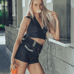 High rise shorts with tight curve hugging design, Features two pockets, timeless denim style