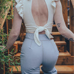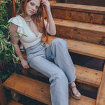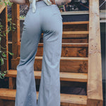 Meet the Billie Bell - a wide- leg, baby blue denim dream, dripping with 70s soul. Designed with bold brass zippers on the front hips and a sky high waist, these flares were made for dance floors, day dreams, and divine struts down memory lane.