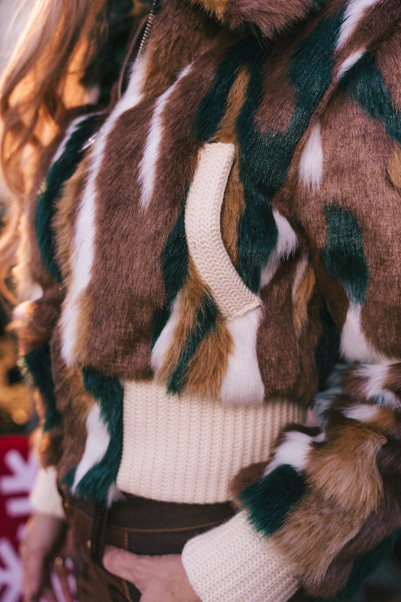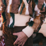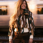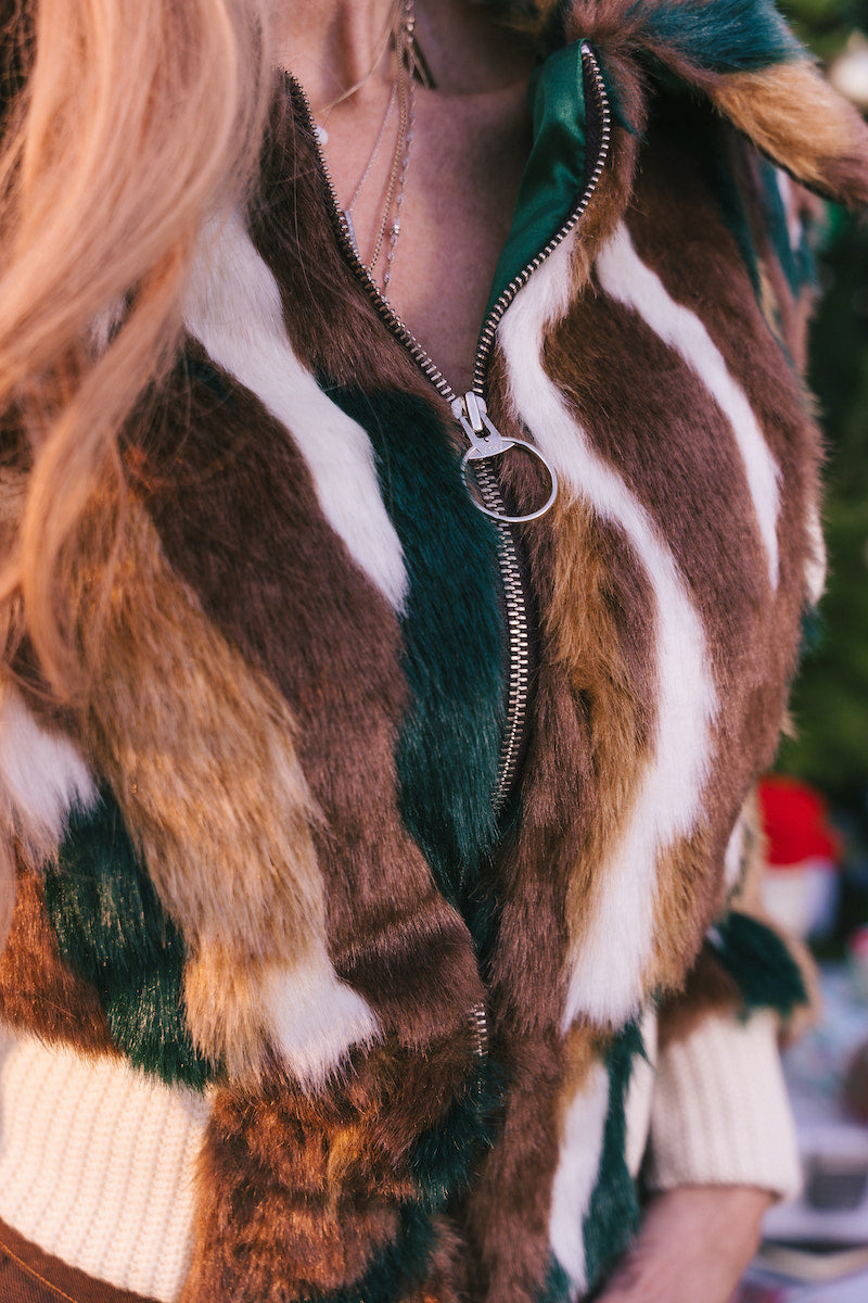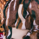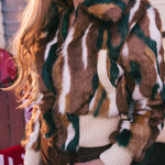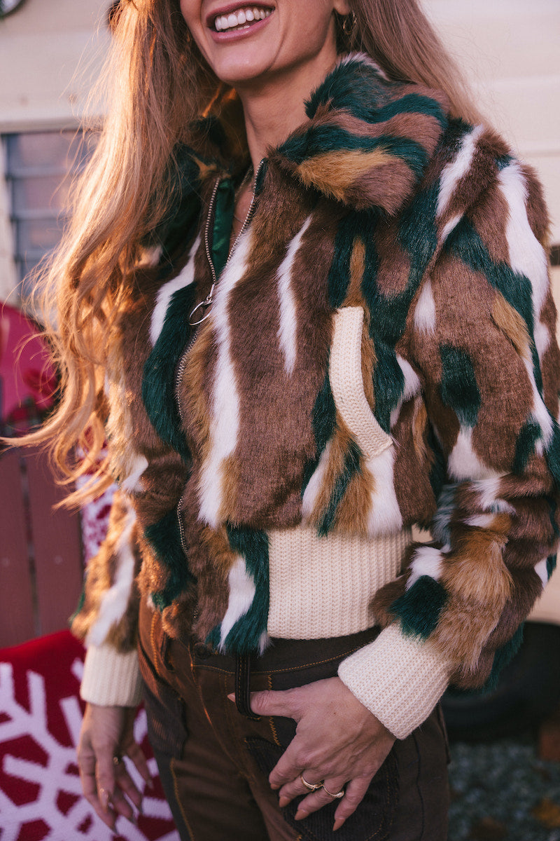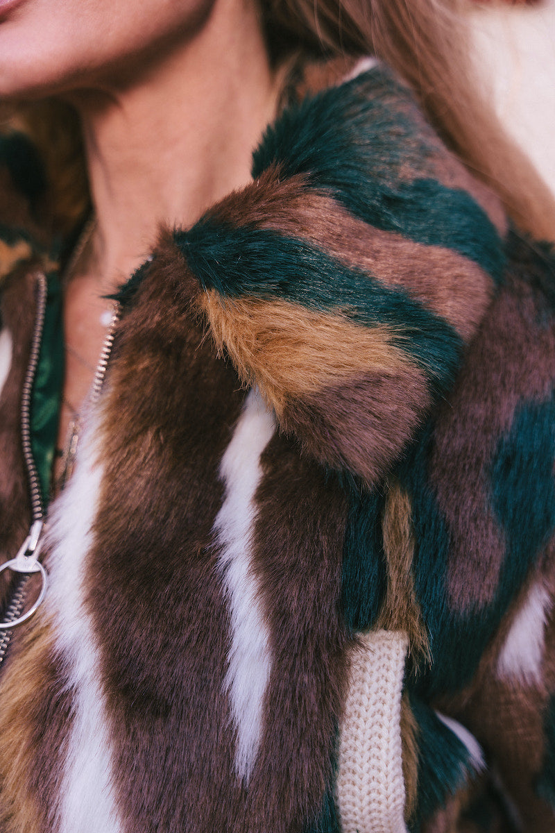 Slip into this multicoloured faux fur bomber and feel like you just strutted out of a 1970's daydream. The green satin lining, plush brown and cream fur and the zip front will dare yo to turn up the heat. Cream knit cuffs and a snug waistband keep it tight in all the right places, giving you tht groovy swagger every soul sister was born to serve.