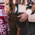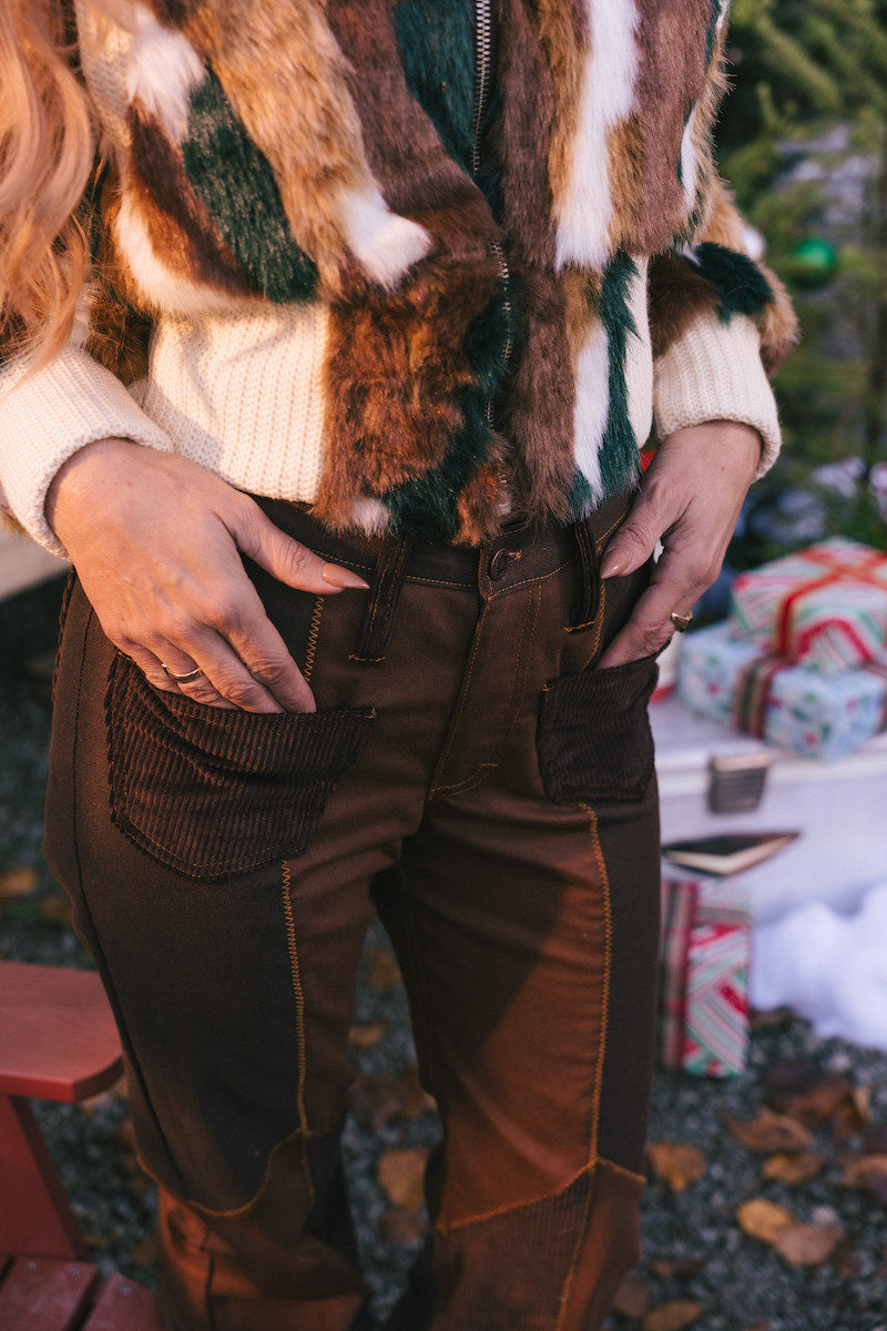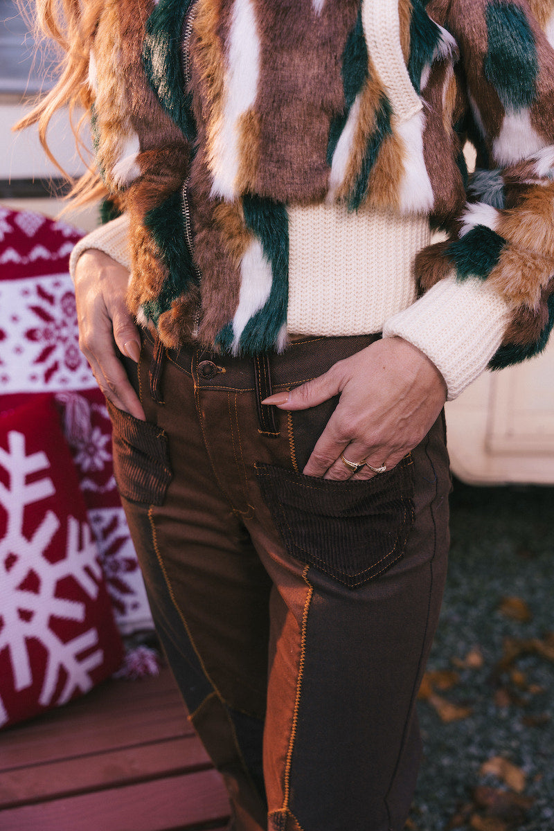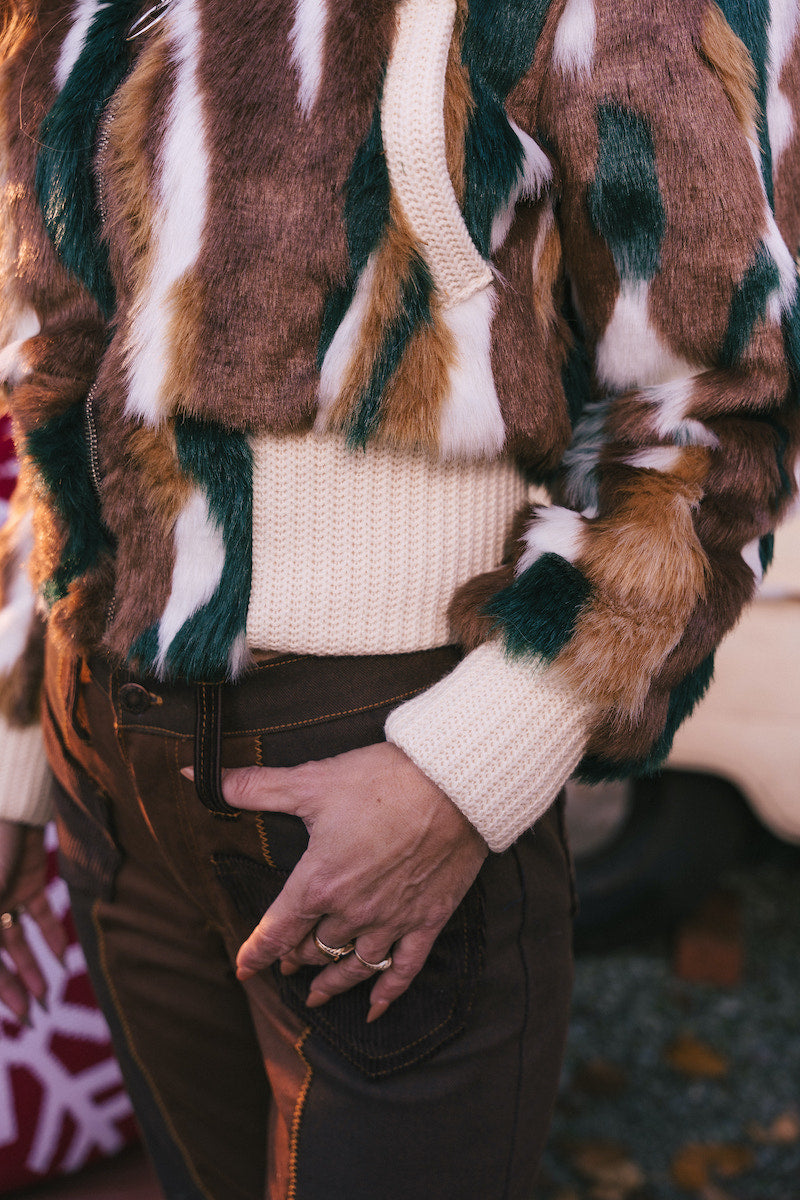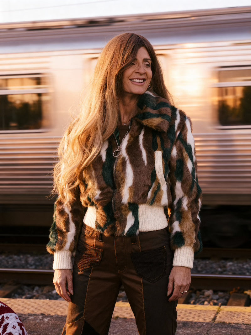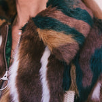 Slip into this multicoloured faux fur bomber and feel like you just strutted out of a 1970's daydream. The green satin lining, plush brown and cream fur and the zip front will dare yo to turn up the heat. Cream knit cuffs and a snug waistband keep it tight in all the right places, giving you tht groovy swagger every soul sister was born to serve.