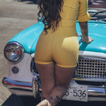 This high-waisted denim romper channels a 70s vibe with a plunging neckline and a sexy, curve-hugging fit.