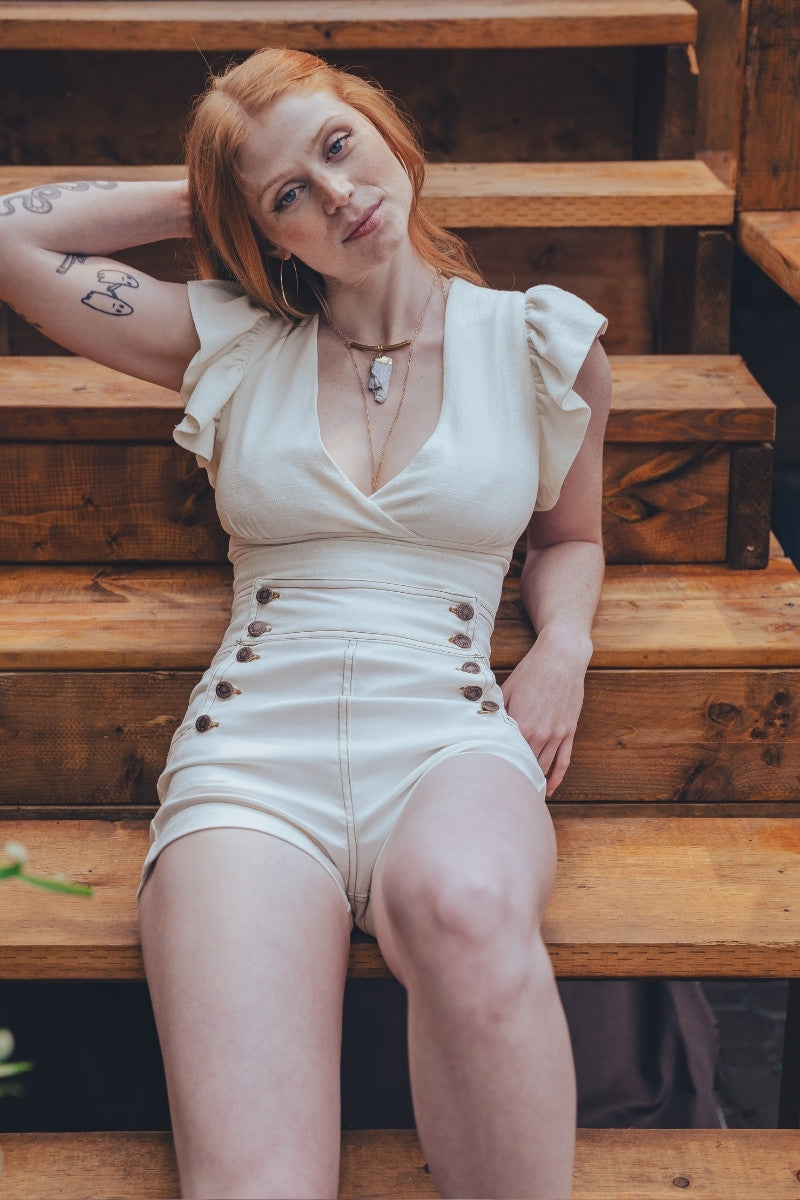 These are the best fitting high rise sailor shorts you will ever own. Designed with the perfect amount of stretch, crafted in light weight white stretch denim and made to flatter curves, respectfully cover your assets and to flaunt your legs!